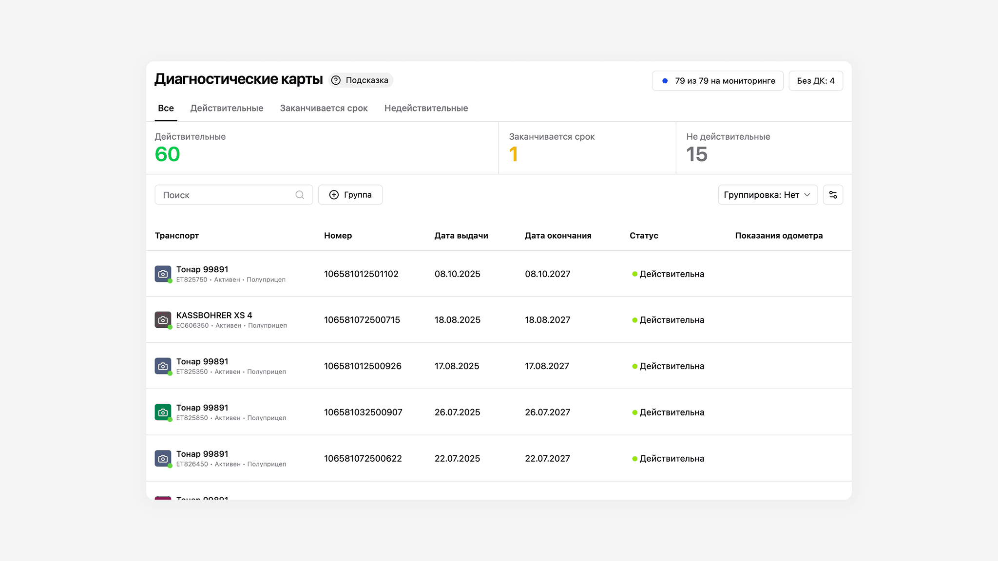 Следите за сроками действия диагностических карт и не допускайте просрочек. Мы напомним о необходимости прохождения техосмотра и сохраним всю историю в системе.