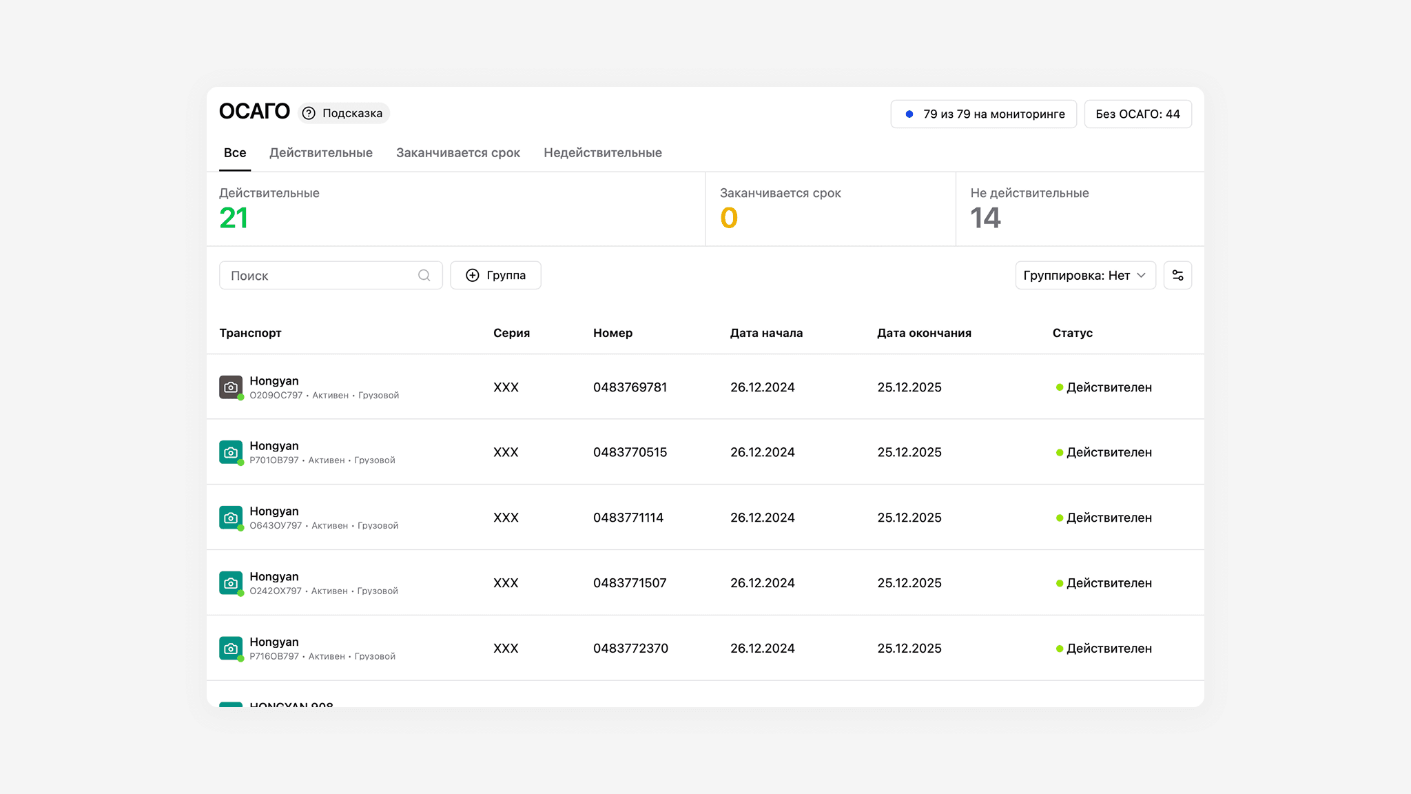 Контролируйте сроки полисов ОСАГО и получайте уведомления о скором окончании. Вся информация по страховкам хранится в системе.