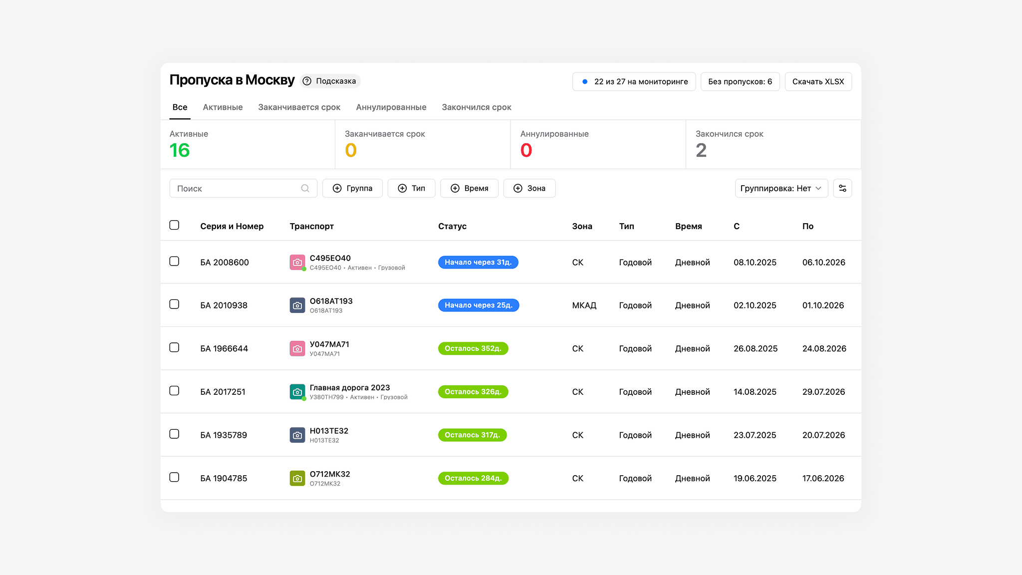 Сроки, статусы, уведомления — всё под контролем в одном месте. Мы следим за актуальностью пропусков, чтобы ваш автопарк работал без сбоев.
