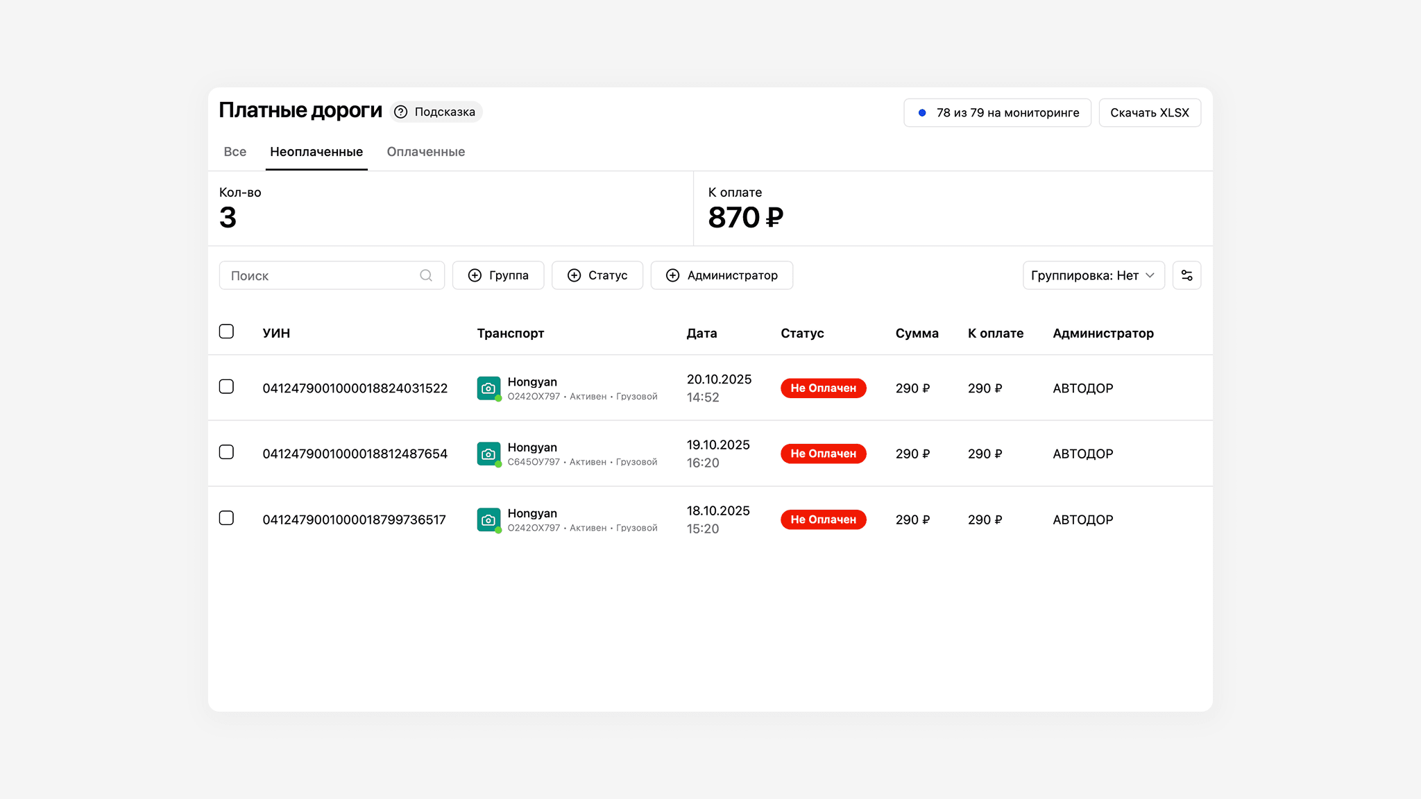 Контроль задолженностей по платным участкам и магистралям. Все данные сохраняются в системе с возможностью выгрузки в 1С. Для погашения задолженностей формируйте платежные поручения или используйте онлайн-оплату картой.