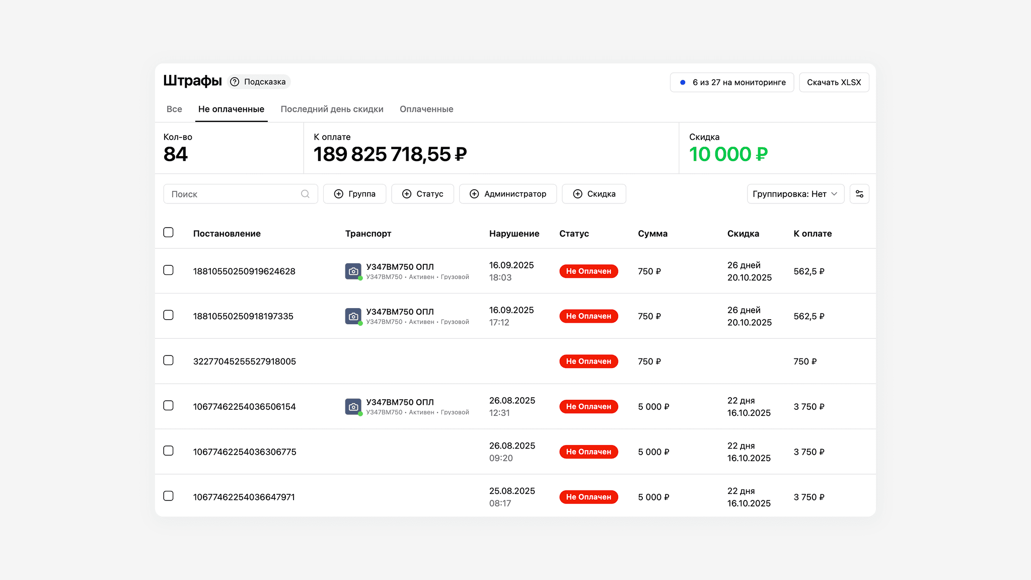 Получайте актуальную информацию по штрафам в режиме реального времени. Все данные сохраняются в системе с возможностью выгрузки в 1С. Для погашения задолженностей формируйте платежные поручения или используйте онлайн-оплату картой.